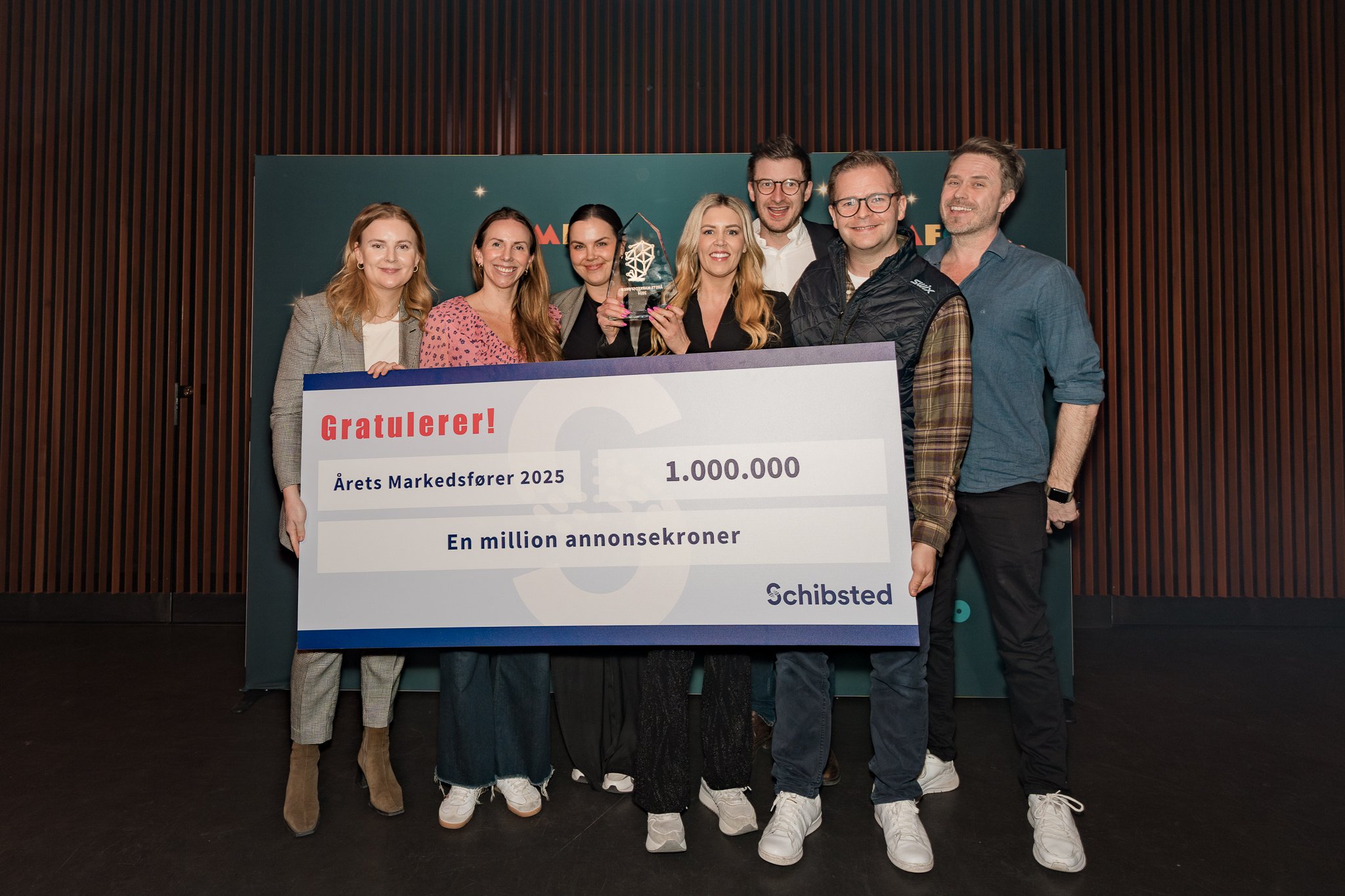 Fra venstre: Gillian Dalslaaen, Director of Brand & Conent i Autostore, Chris Wyatt McMillan, Business Director i Wavemaker, Kathrine Saastad, Digital account Executive i Salesforce, Anniken Volckmar, Key Account Manager i Tine og styremedlem MFO, Kristian Wulfsberg Majer, CEO i Motivation Branding og juryleder, Nina Mikaelsen, Markedsdirektør i Oda og fjorårets vinner. Ikke tilstede: Espen Haugen, Managing Director & Planner i 11:11.